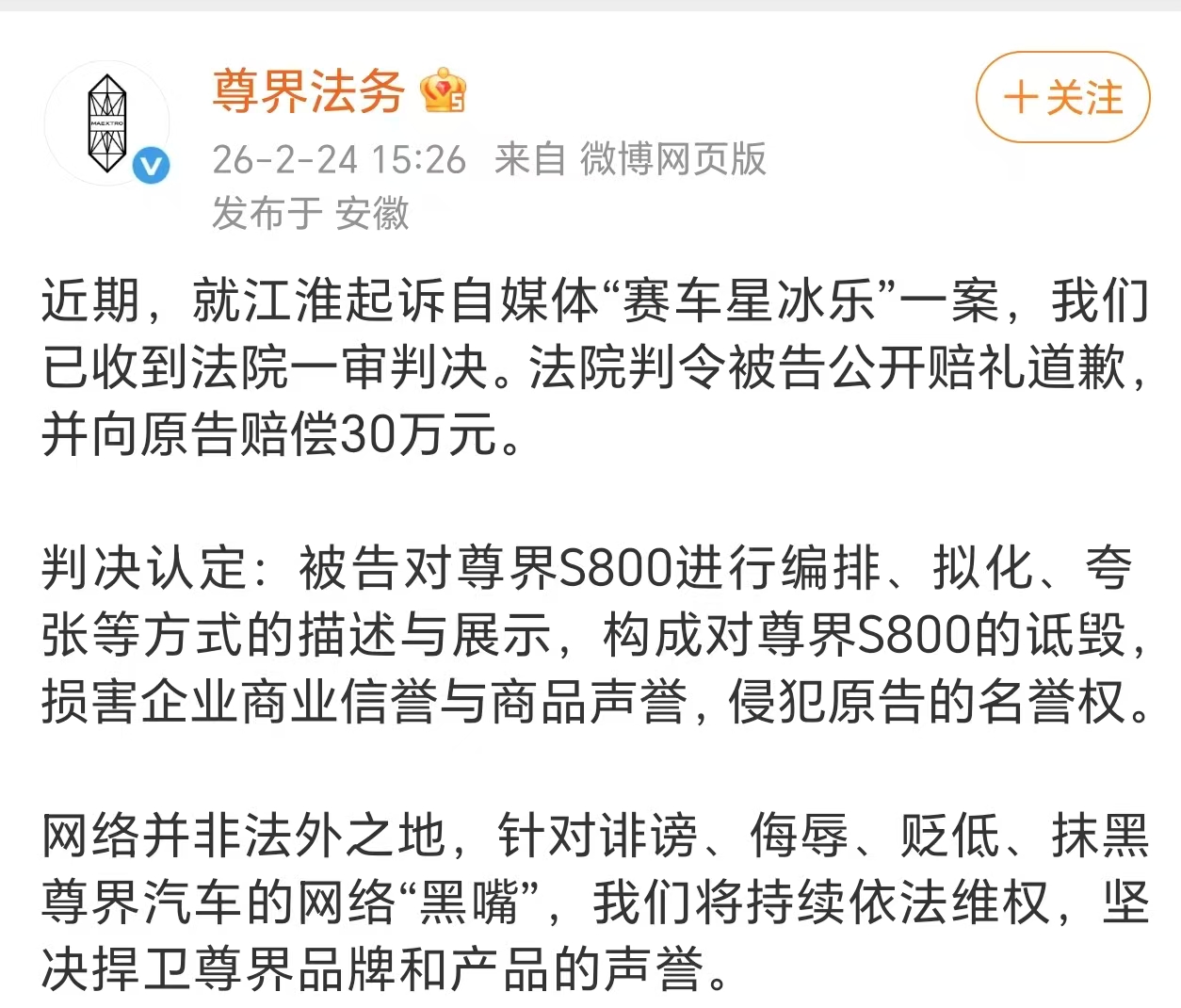 同日,尊界法务也发布声明称,近期,就江淮起诉自媒体“赛车星冰乐”一案,公司已收到法院一审判决。法院判令被告公开赔礼道歉,并向原告赔偿30万元。判决认定:被告对尊界S800进行编排、拟化、夸张等方式的描述与展示,构成对尊界S800的诋毁,损害企业商业信誉与商品声誉,侵犯原告的名誉权。